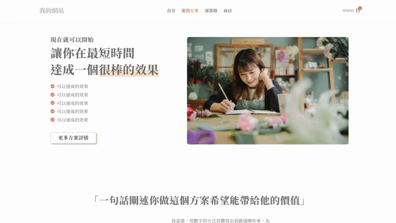 從品牌定位、文字內容到網站架構,我會一步步陪你釐清思緒,把你腦中的想法轉化成說得清、說得動人的品牌語言。我相信每個品牌都有值得被聽見的故事,而網站,不該只是門面,而是你與世界連結的起點。就算你從來沒架過站、不知道該從哪裡開始,也沒關係——我會陪你,一起走完這條路。如果想要了解我,可點此觀看完整品牌故事